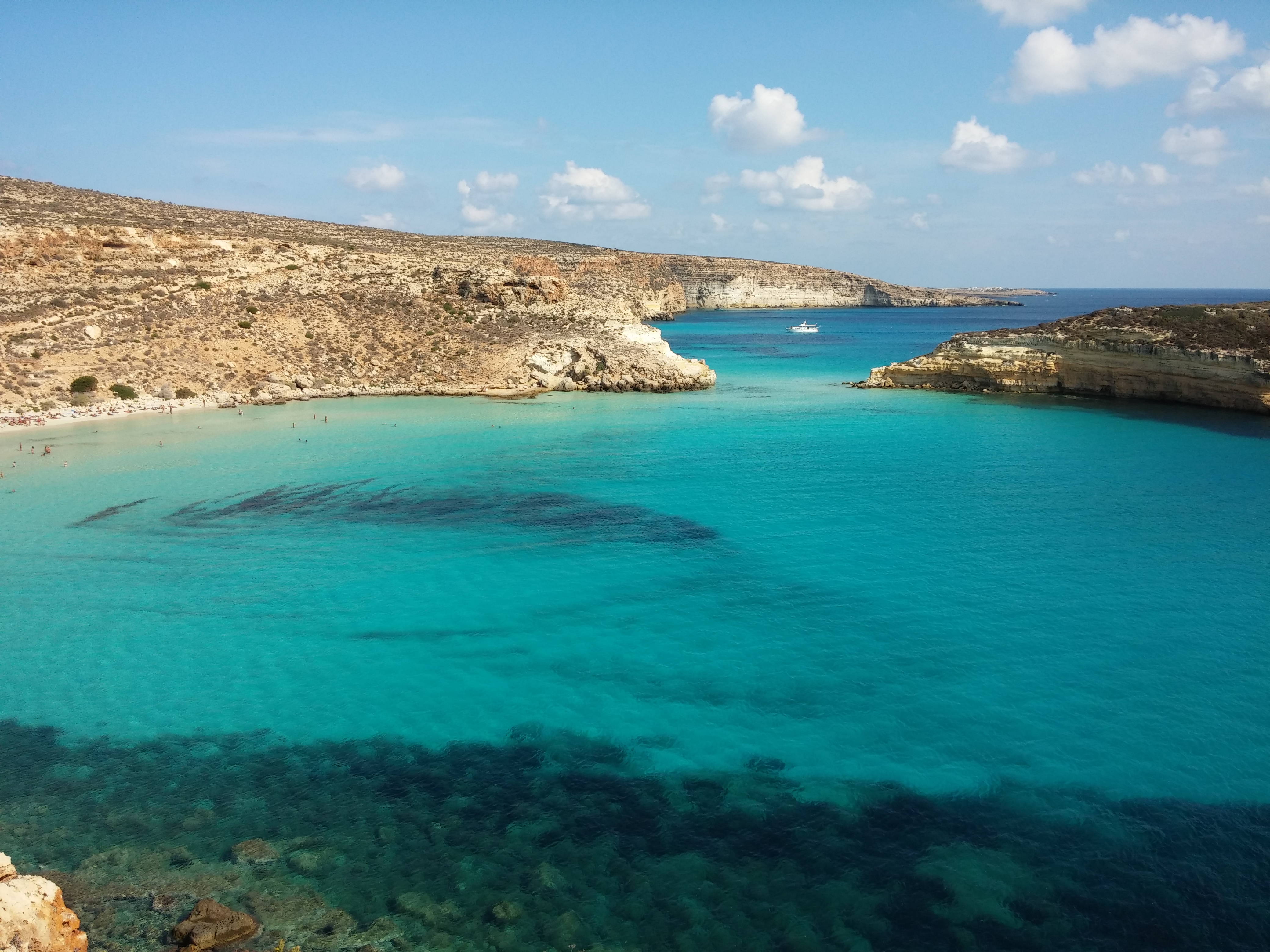 Lampedusa è l’Italia più sperduta… si trova più a sud di Pantelleria, più a sud di Tunisi, più a sud anche di Malta… ma è ancora imperturbabilmente Italia 😄. Appartiene, insieme a Linosa e Lampione, alle isole Pelagie ed ha una superficie allungata e molto piccola, circa 20 km quadrati su 33 km di perimetro. E’ un’isola tutta piana, raggiunge la sua maggiore altitudine, pari a 133 metri, soltanto lungo le falesie della costa nord ovest… per il resto è una distesa di sabbia e scogli molto chiari circondati da un mare azzurro che, in una particolare zona dell’isola rappresentata nella foto di apertura e di cui racconterò a breve, è stato eletto uno dei più belli del mondo. Si può non essere d’accordo con questa affermazione, io personalmente ritengo che l’Italia abbia molti posti che possano contendersi questa corona, ma la spiaggia dei Conigli lascia davvero a bocca aperta quando la si scopre e fa pronunciare la frase tipica di noi romani “ammazza che mare!”… l’abitudine ad Ostia offusca il ricordo dell’acqua trasparente 😄