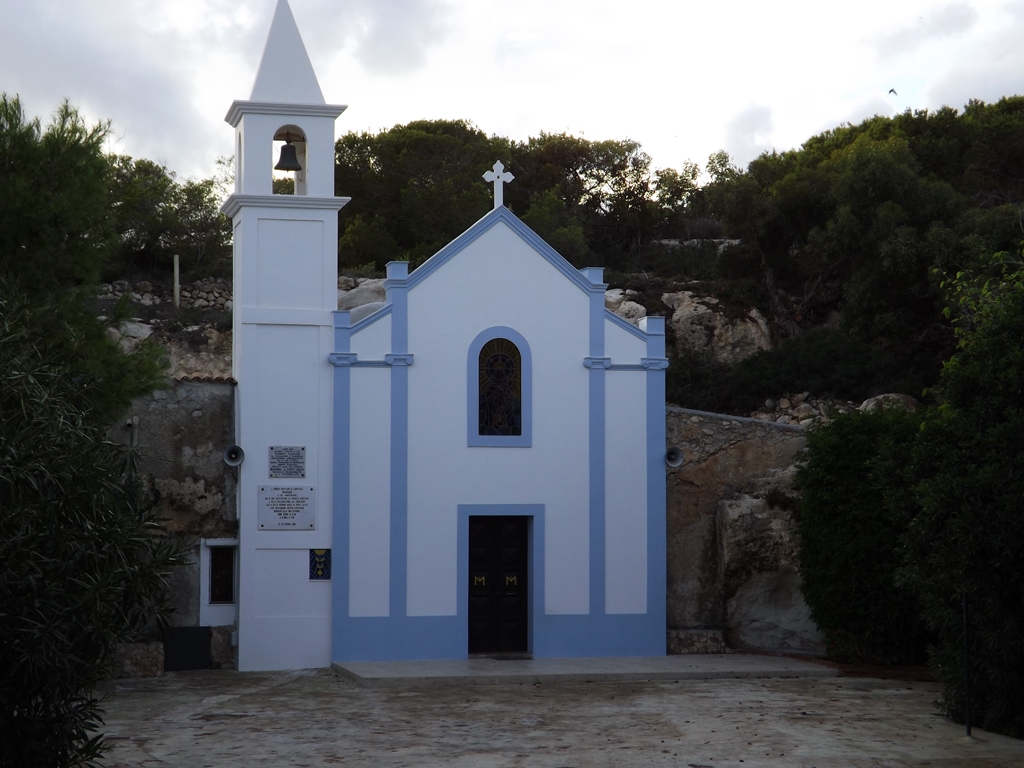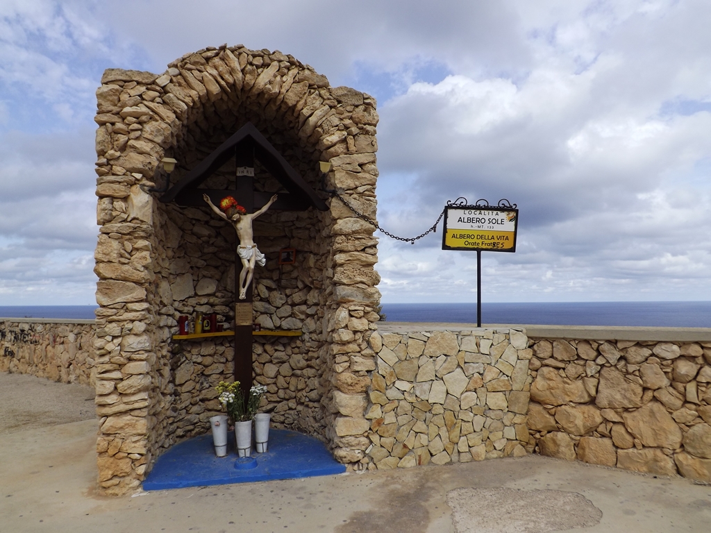 Capo Ponente, il punto più alto dell’isola chiamato anche “Albero Sole” o, come è definito dai locali, “u Signuruzzu”. E’ una piccola costruzione semicircolare che custodisce un crocifisso ligneo contornata da muretti di pietra. Oltre questi ultimi c’è un impressionante strapiombo sul mare e si gode della vista sulle falesie e sul Faraglione, chiamato anche scoglio a vela.