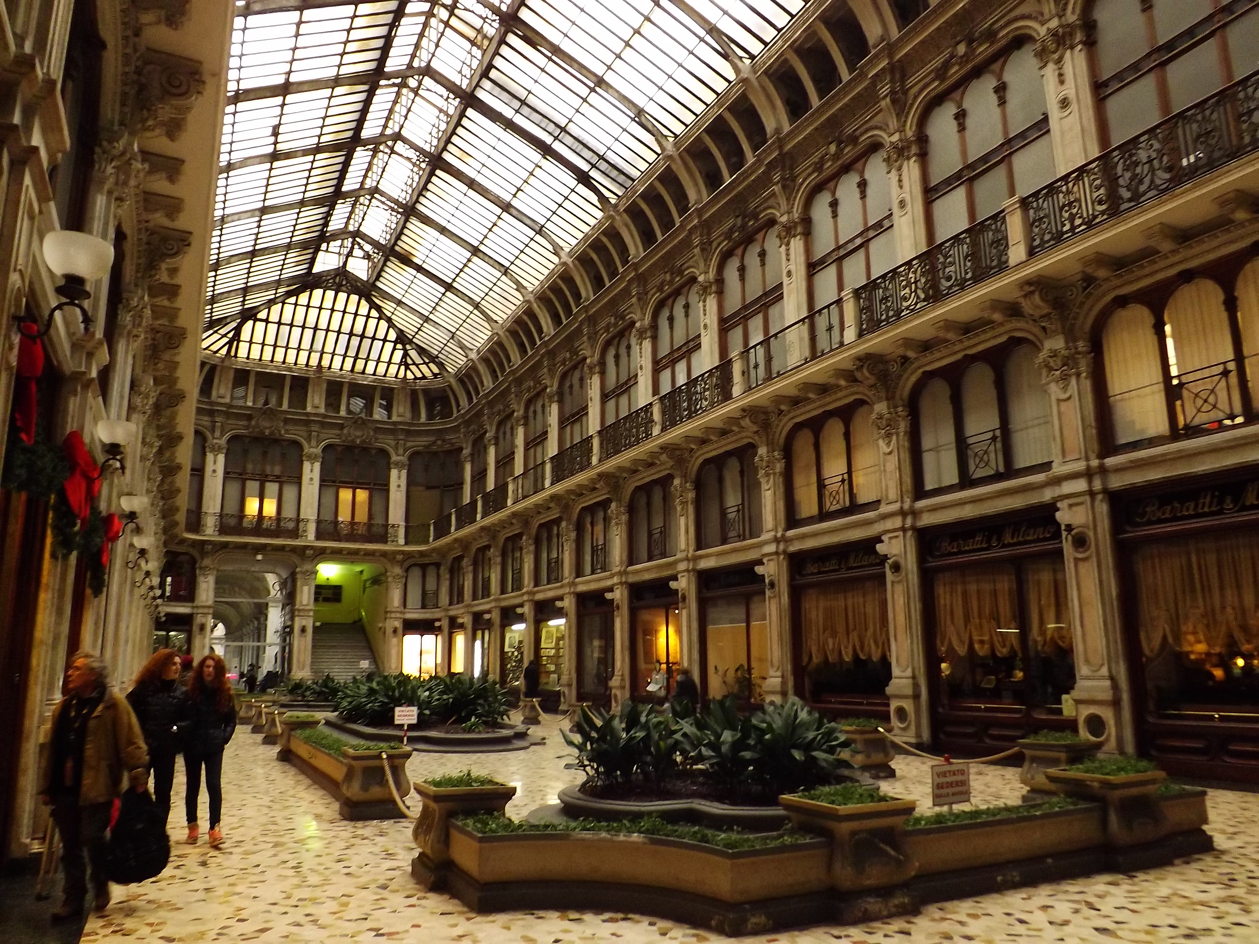 A proposito di gallerie, una molto bella che ha attirato la mia attenzione è stata la galleria Subalpina, storico edificio della fine dell’ottocento a cui si accede dai portici di Piazza Castello, che ospita numerosi locali commerciali. È caratterizzato da balconate in ferro battuto che ricordano i palazzi di Parigi, soffitti altissimi e tetto in vetro. Uno di questi locali, bello come la galleria che lo ospita, è il caffè pasticceria Baratti e Milano, nato nel 1875 e mantenuto come allora grazie ad una serie di restauri anche a seguito dei bombardamenti della seconda guerra mondiale. La caffetteria al suo interno è un elegantissimo ambiente caratterizzato da specchi, marmi, bronzi, dorature e stucchi che gli conferiscono un ricco profilo architettonico e artistico. Inoltre questa sua particolare bellezza gli ha garantito la costante presenza della borghesia torinese nonchè varie citazioni in ambito letterario e l’ambientazione di alcune scene cinematografiche.