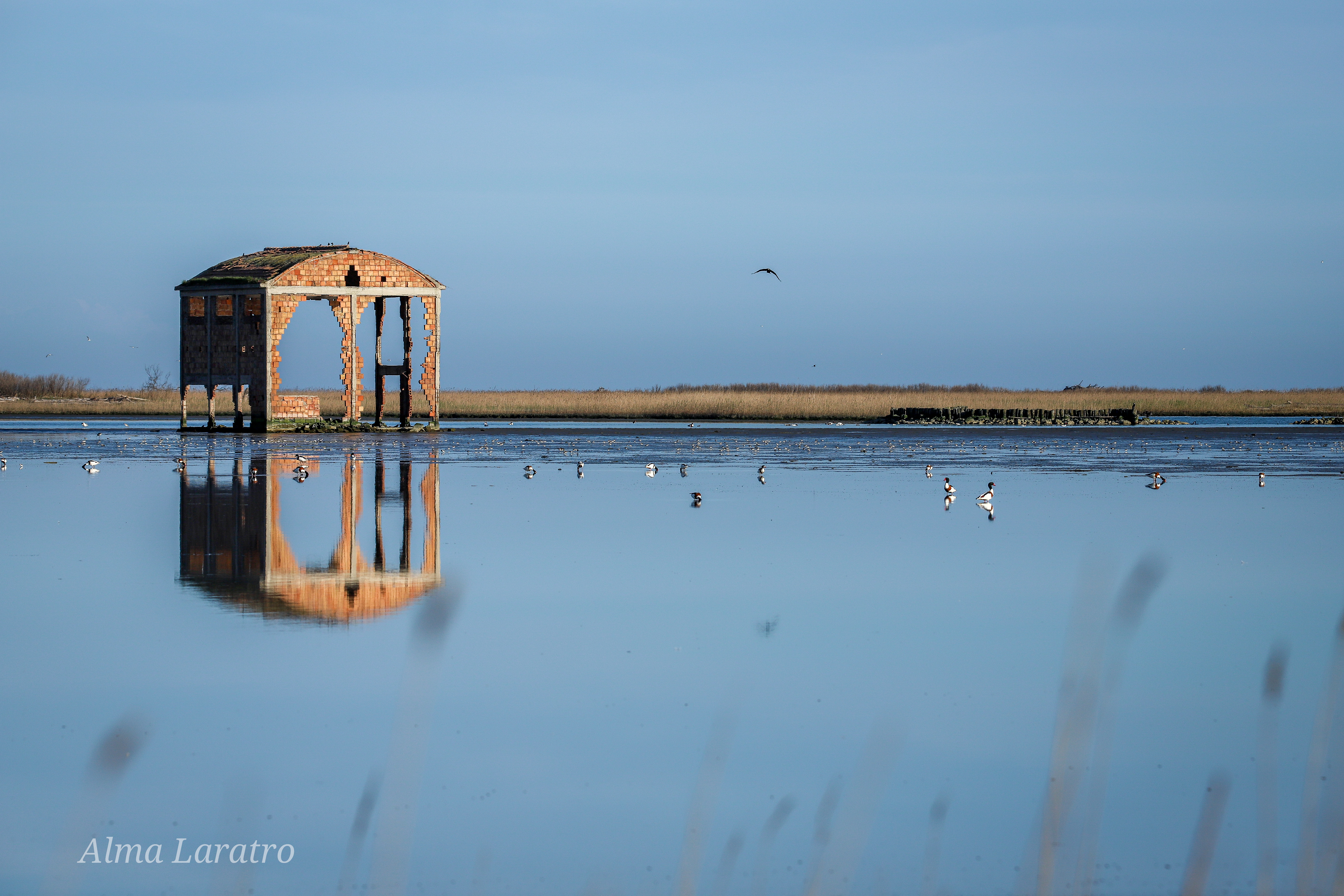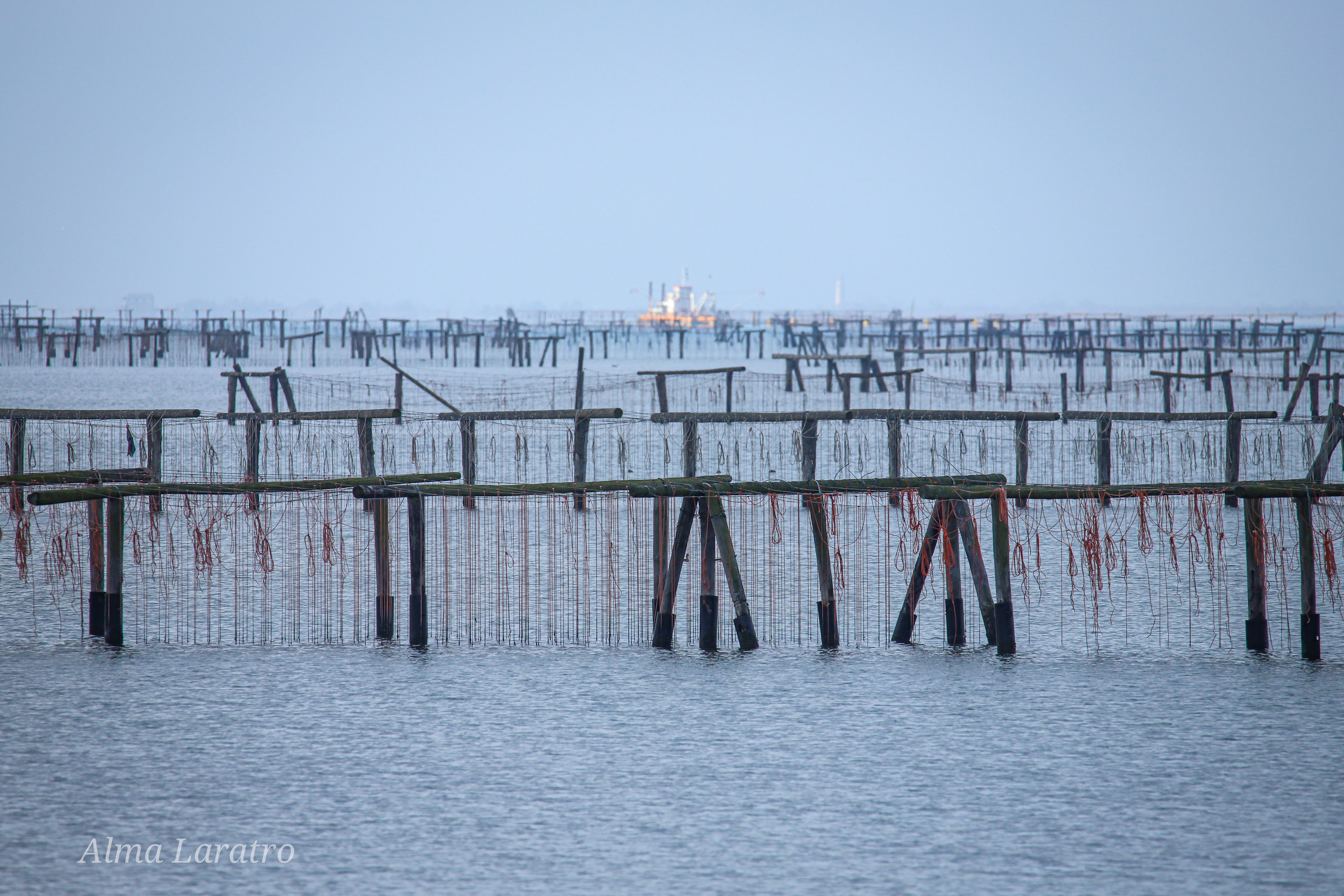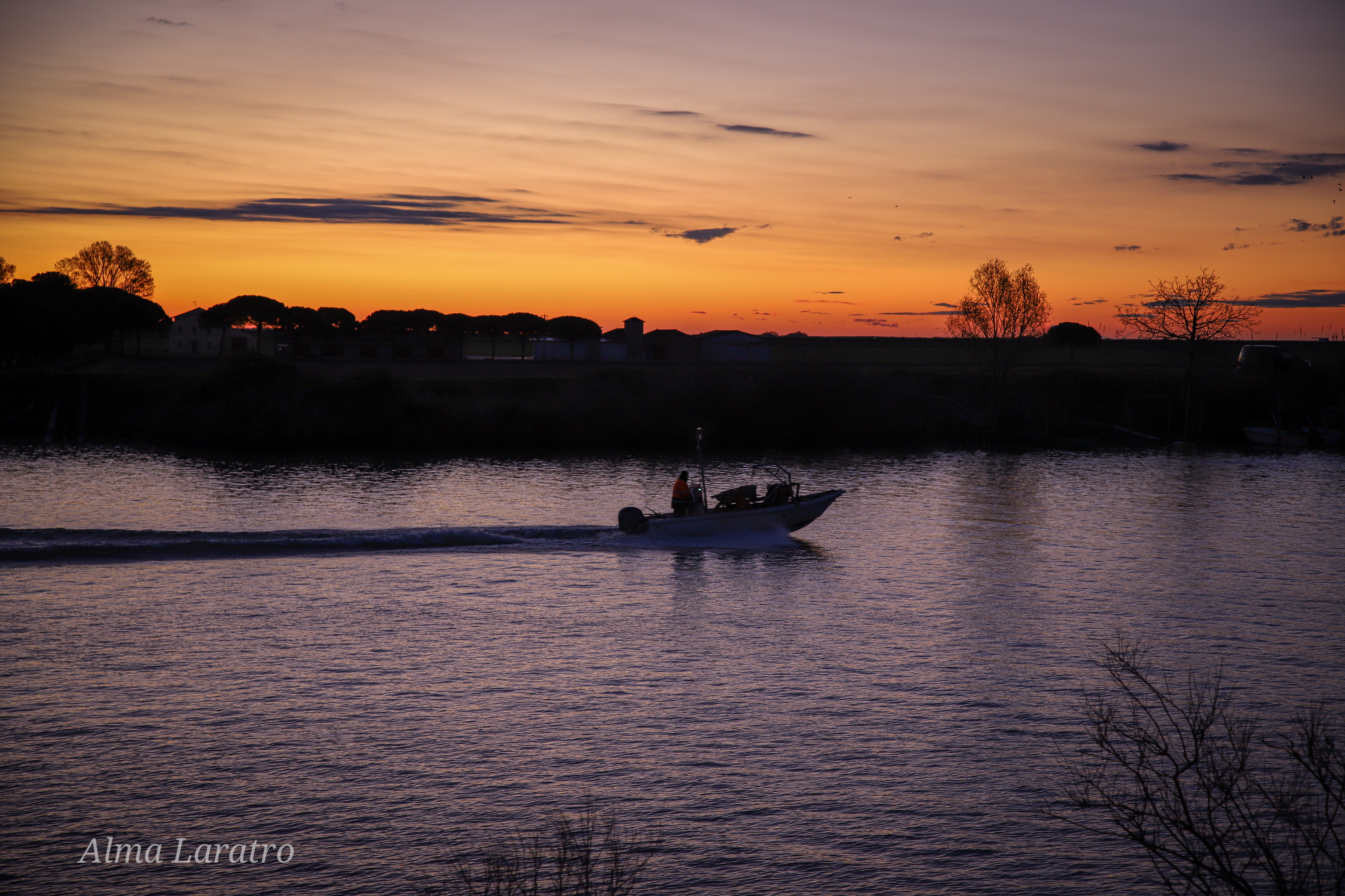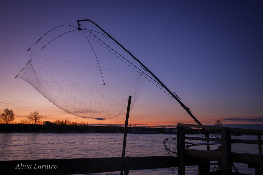 La delicata nebbiolina mattutina rende l’atmosfera soffusa e pigra, l’acqua scorre lenta verso il mare, i colori sfumano tra di loro senza forti contrasti, mentre in altri frangenti si delineano con nettezza, l’alba e il tramonto si specchiano nelle acque, facendosi una vanitosa concorrenza.